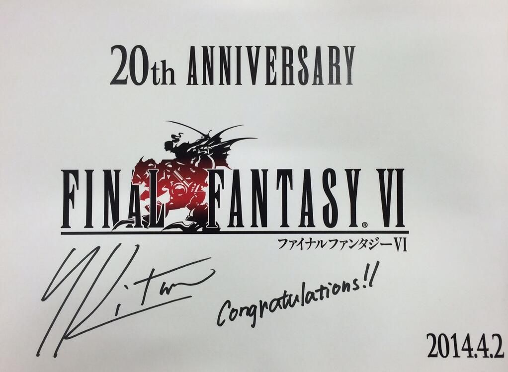 2 เมษายน 1994 เป็นวันที่ Final Fantasy VI ได้เริ่มวางจำหน่ายให้กับเครื่อง SFC ในประเทศญี่ปุ่น ซึ่งนับมาถึงวันนี้ก็เป็นเวลา 20 ปีแล้ว โดยภาคนี้ถือว่าเป็นจุดเริ่มต้นของช่วงยุคสมัยที่รุ่งเรืองที่สุดของ Final Fantasy ในโอกาสนี้คุณโยชิโนริ คิตาเสะ หนึ่งในสองผู้กำกับเกมดังกล่าว (ร่วมกับคุณฮิโรยูกิ อิโต) ก็ได้ทวีตข้อความระลึกถึงเรื่องนี้ไว้ว่า